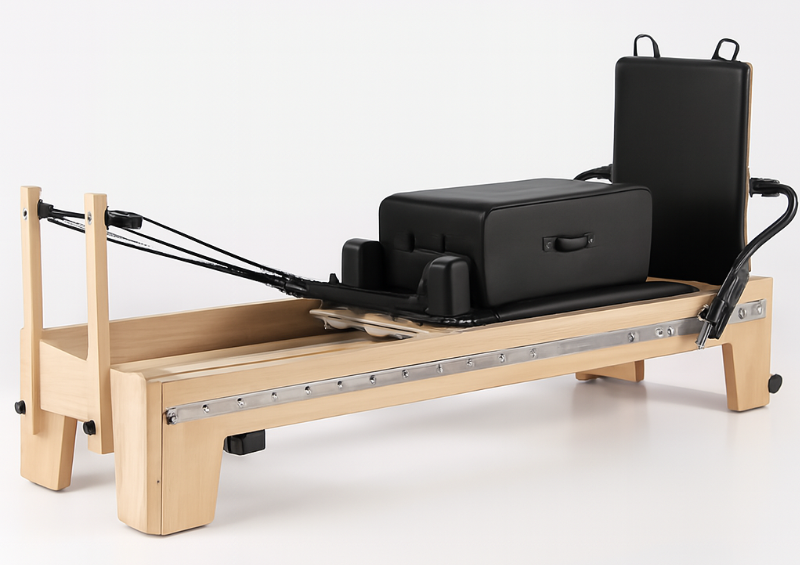 Unlike typical entry-level reformers, the Maple Wood Full-Track Pilates Reformer integrates an aluminum full-length rail and imported piano-wire springs to ensure consistent, whisper-quiet resistance. Even after long-term daily use, the carriage glides with precision — no wobbling, no drag.